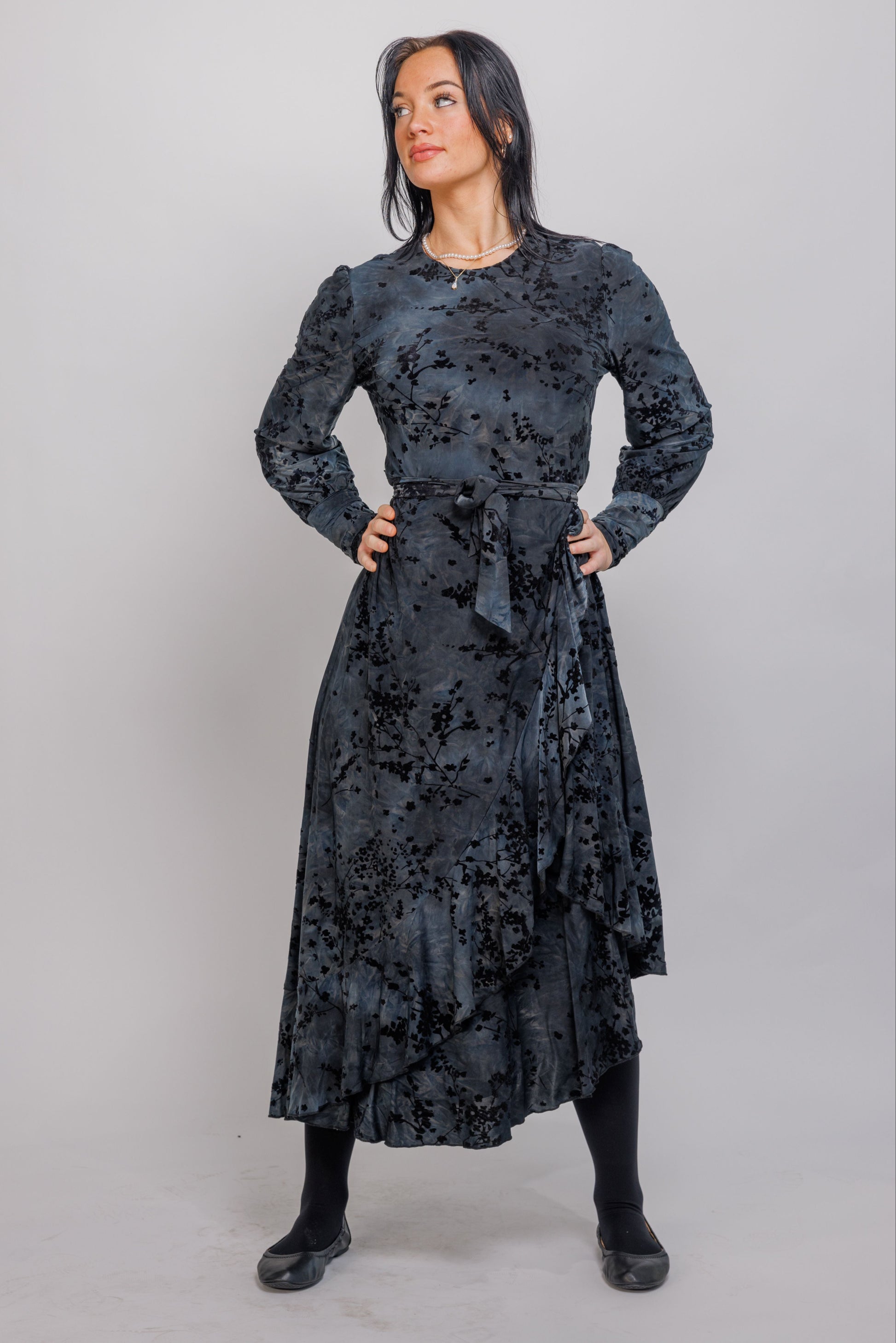 cut velvet belted dress with vertical ruffle, can be straight hem